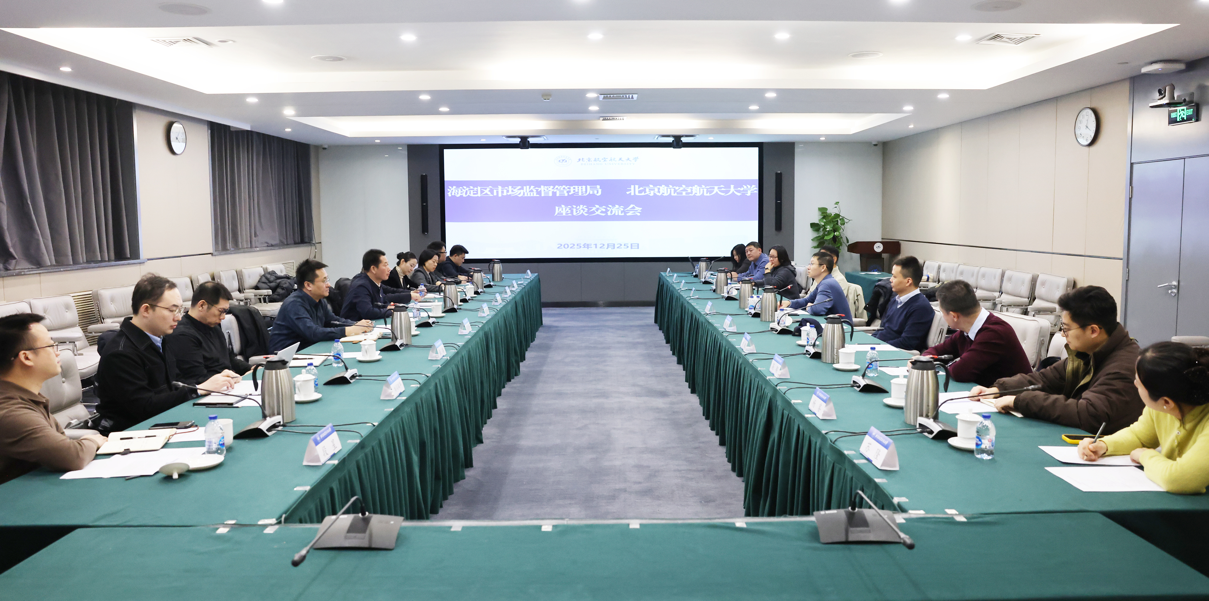 2025年12月25日,海淀区市场监督管理局党组书记、局长聂俊杰带队赴我校开展调研交流。我校党委常委、副校长吴江浩、继续教育学院负责人陪同参观了北航校史馆和北航科技成果展。参观结束后,双方在北航如心会议中心中报告厅召开座谈会,教务部、党政办公室、继续教育学院、后勤服务中心等相关部门负责人参会,教务部部长钱政主持会议。